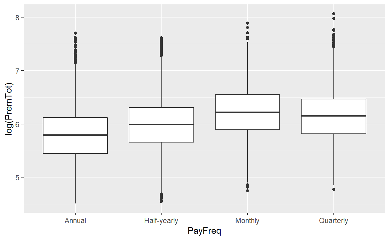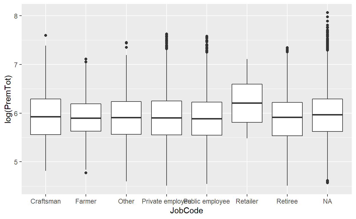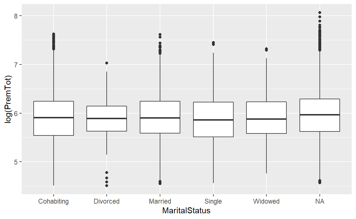For example, I am interested to find out the boxplot of all the factor variables against PremTot. The code chunk below has shown how we could pipe the different functions together to select all the factor columns and extract out the column names as a list.