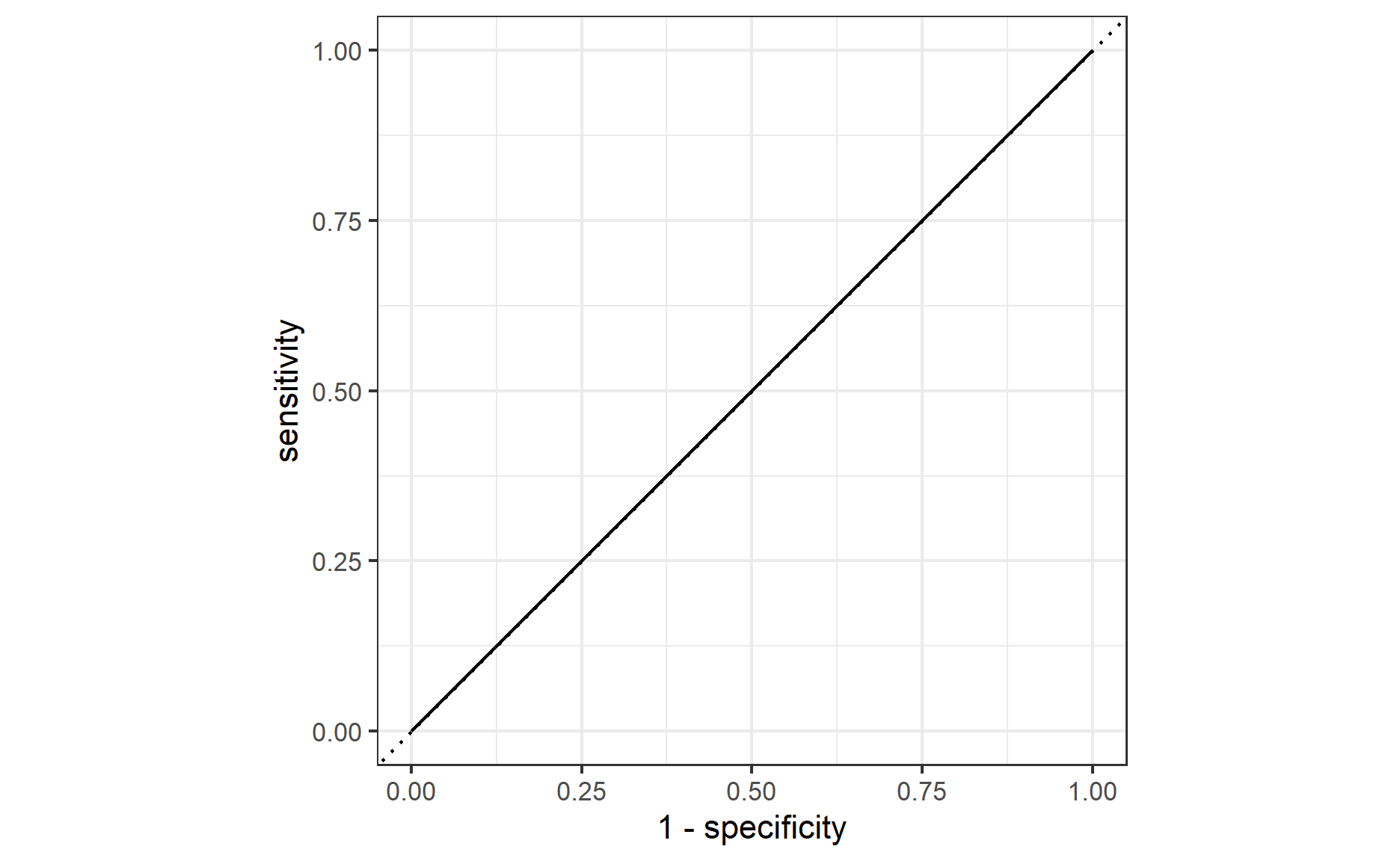 The ROC curve for this model lie at the diagonal line, suggesting that this fitted model has no predictive power. It is as good as we take a random guess whether the selected policy will make a claim.