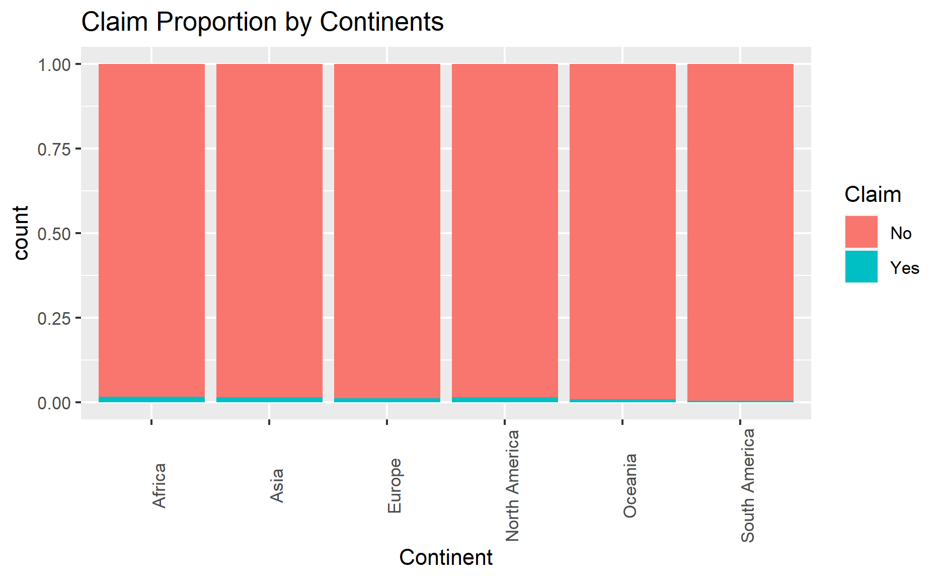 As the proportion of claim policies is rather low, it is hard to compare the claim proportion across different continents.