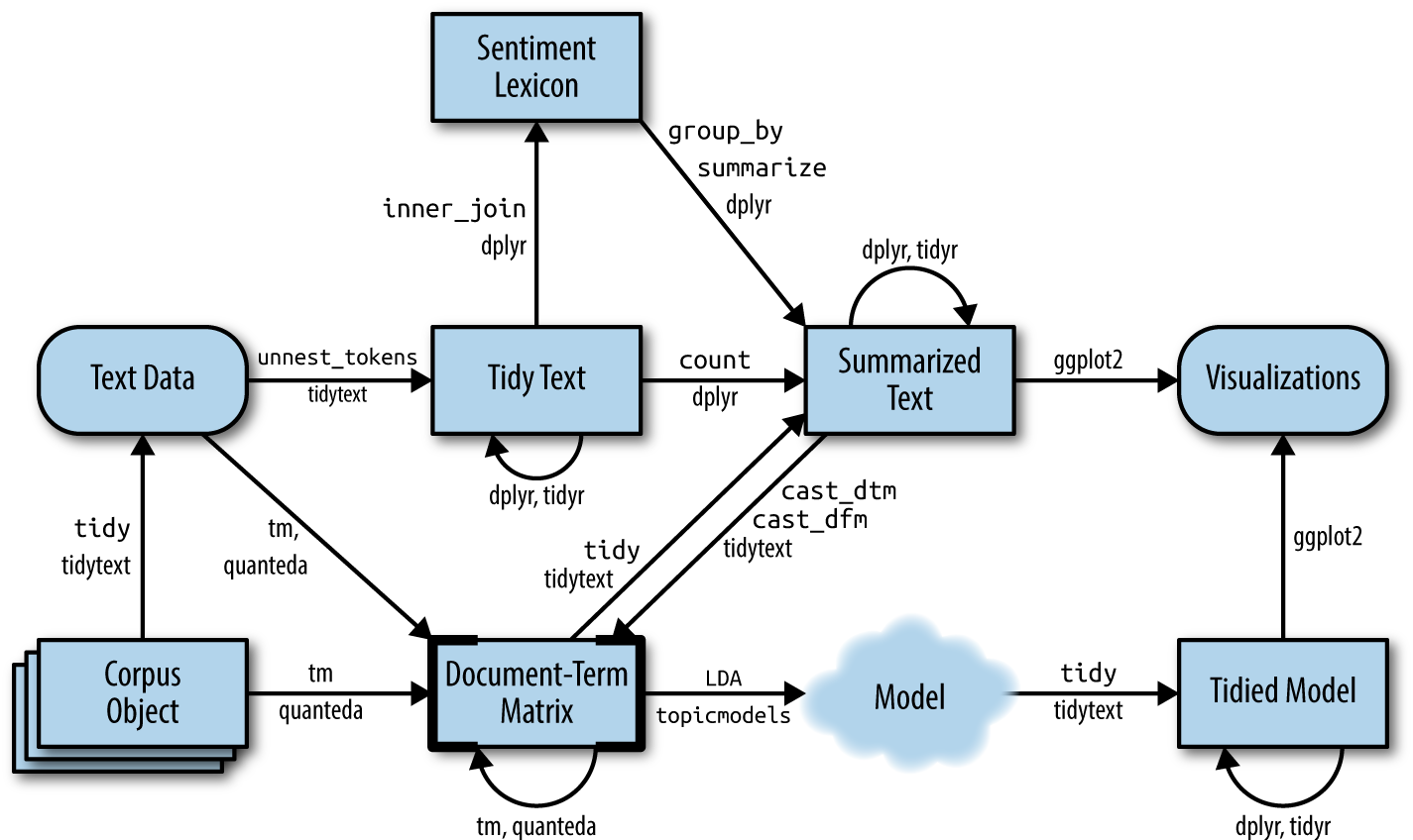 Following are how the different text analytics R packages could work together (Silge and Robinson 2021):