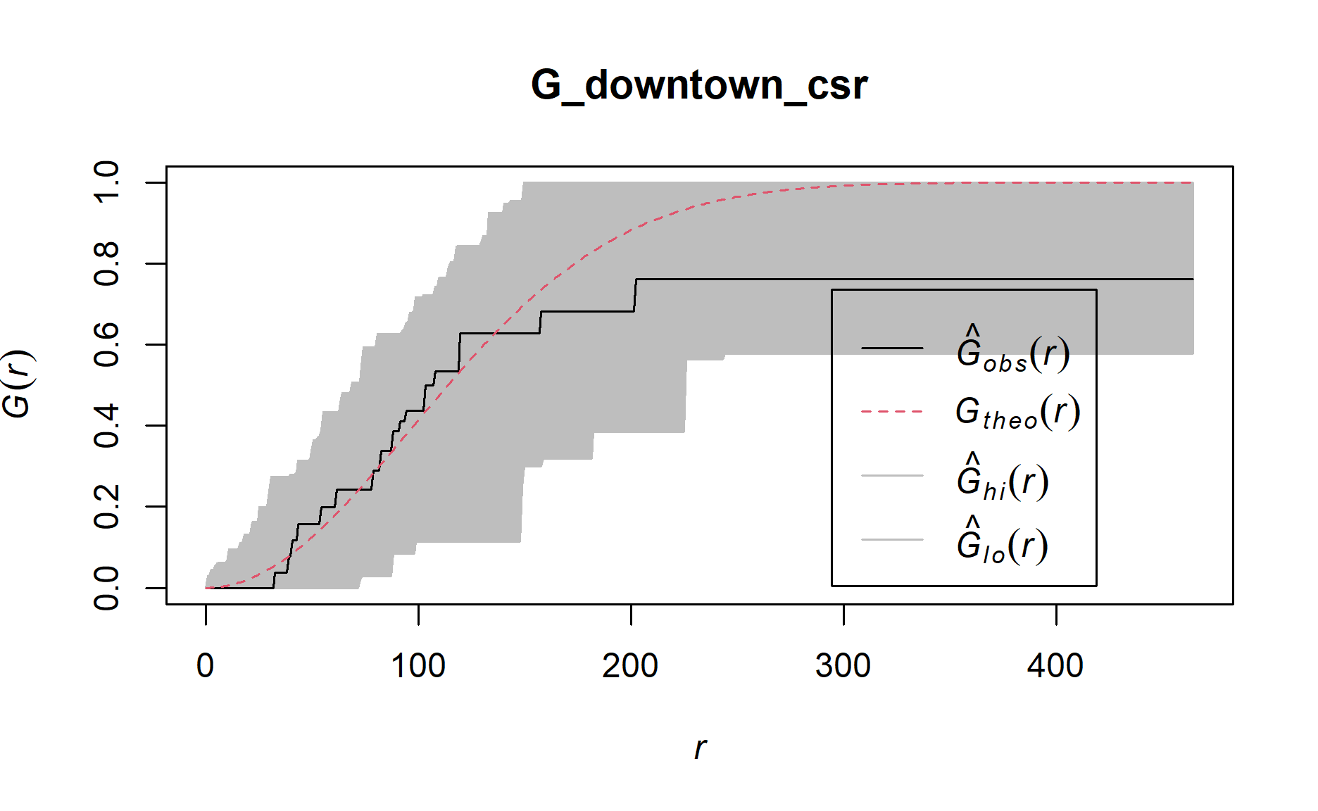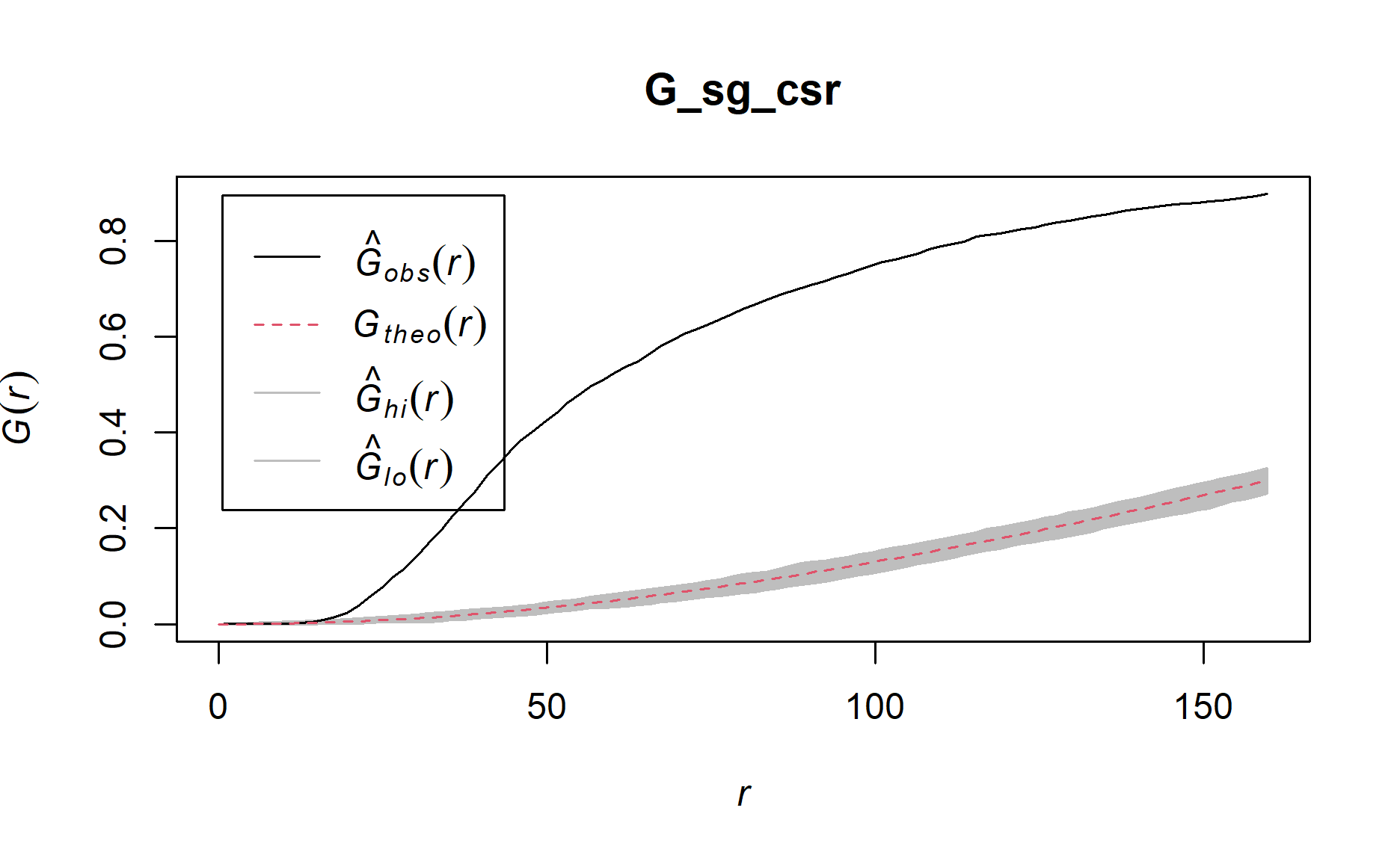 Finally, we will pass the point pattern object into the G function to perform the necessary statistical test.