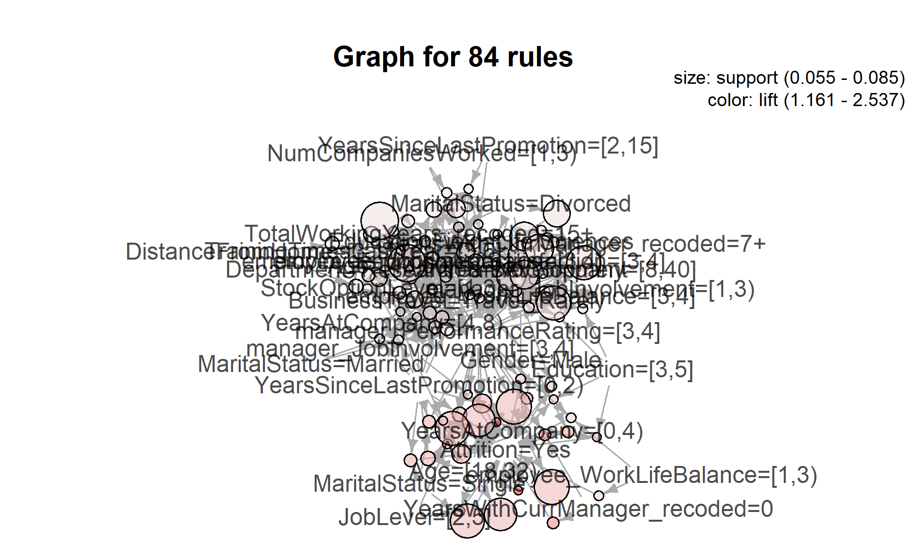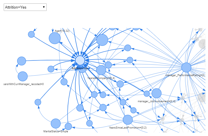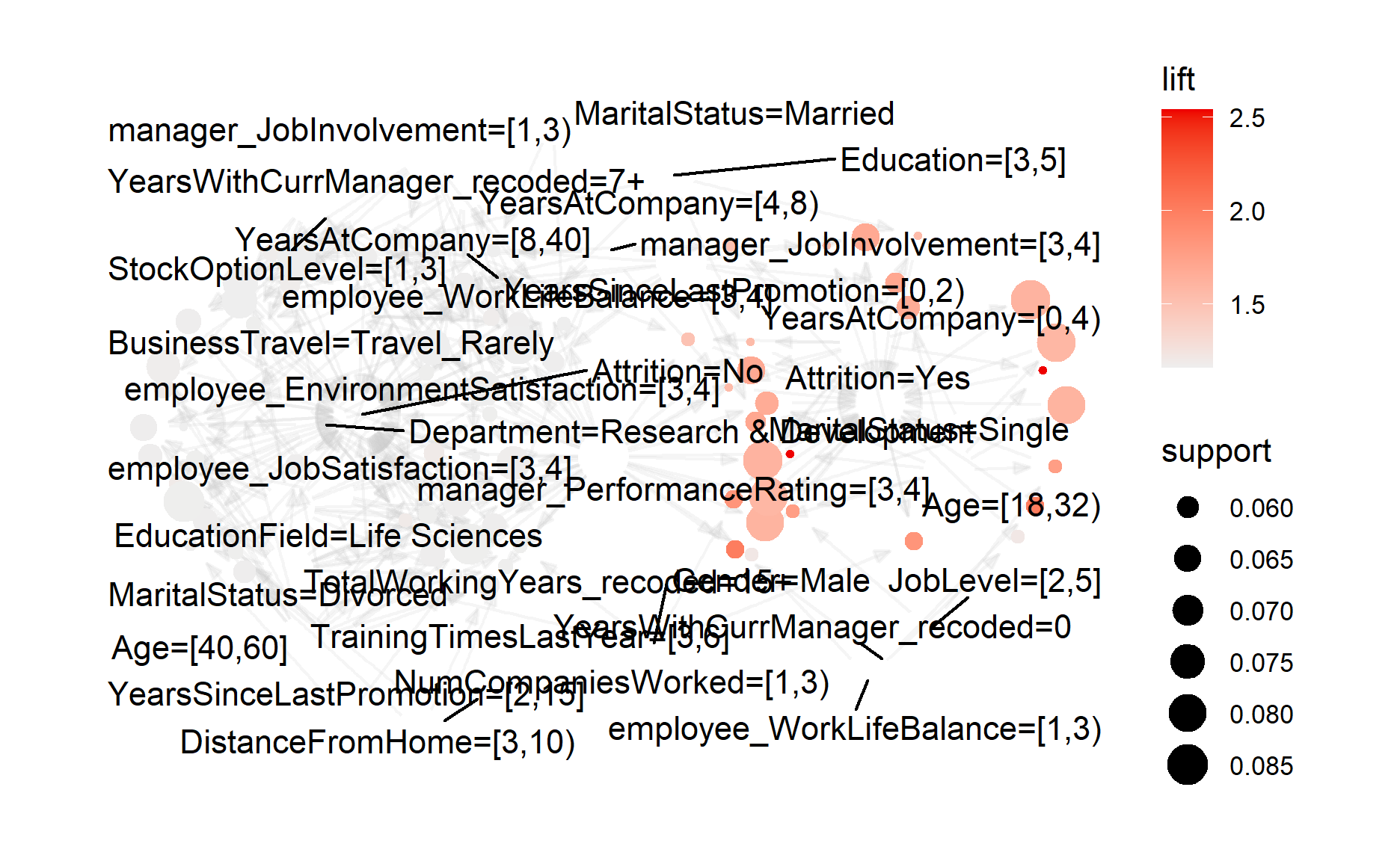 If we were to highlight the nodes associated with attrition = yes, below are the characteristics of employees with relatively higher attrition: