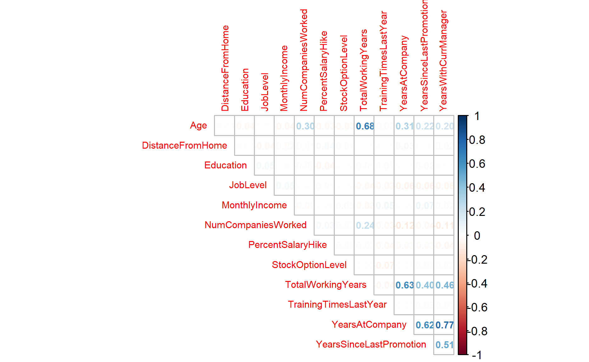 For example, from the correlation matrix above, Age and TotalWorkingYears are positively correlated. This makes sense as in general, we could expect older employees would have more working experience.