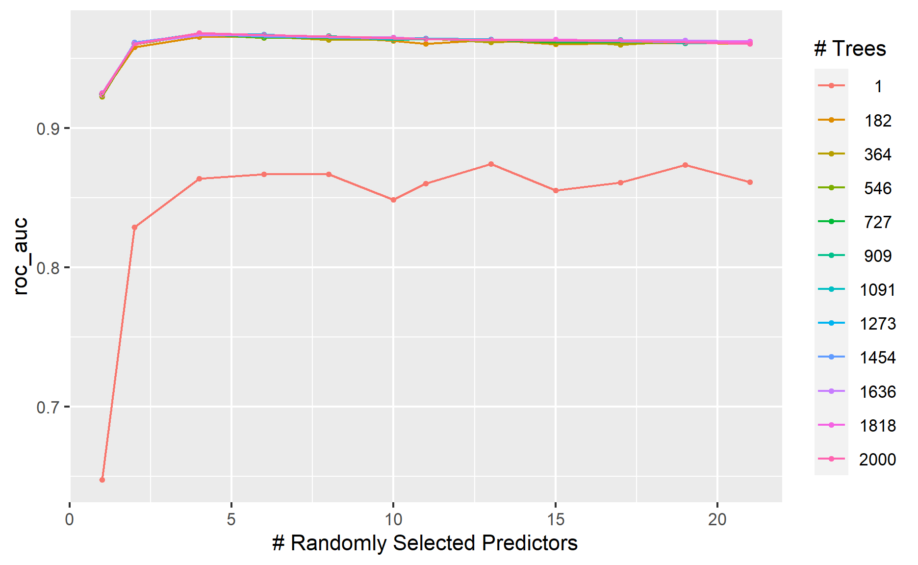 As shown in the graph, AUC tends to be low when the number of randomly selected predictors and number of trees is low. AUC results are quite comparable when the number of randomly selected predictors and the number of trees increases.