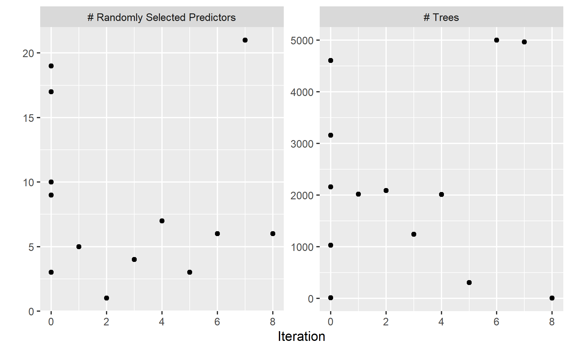 Also, if we take a look at the model results from bayes optimization, the results show that the algorithm didn’t spend much time in searching the hyperparameters at the region where mtry value is low.