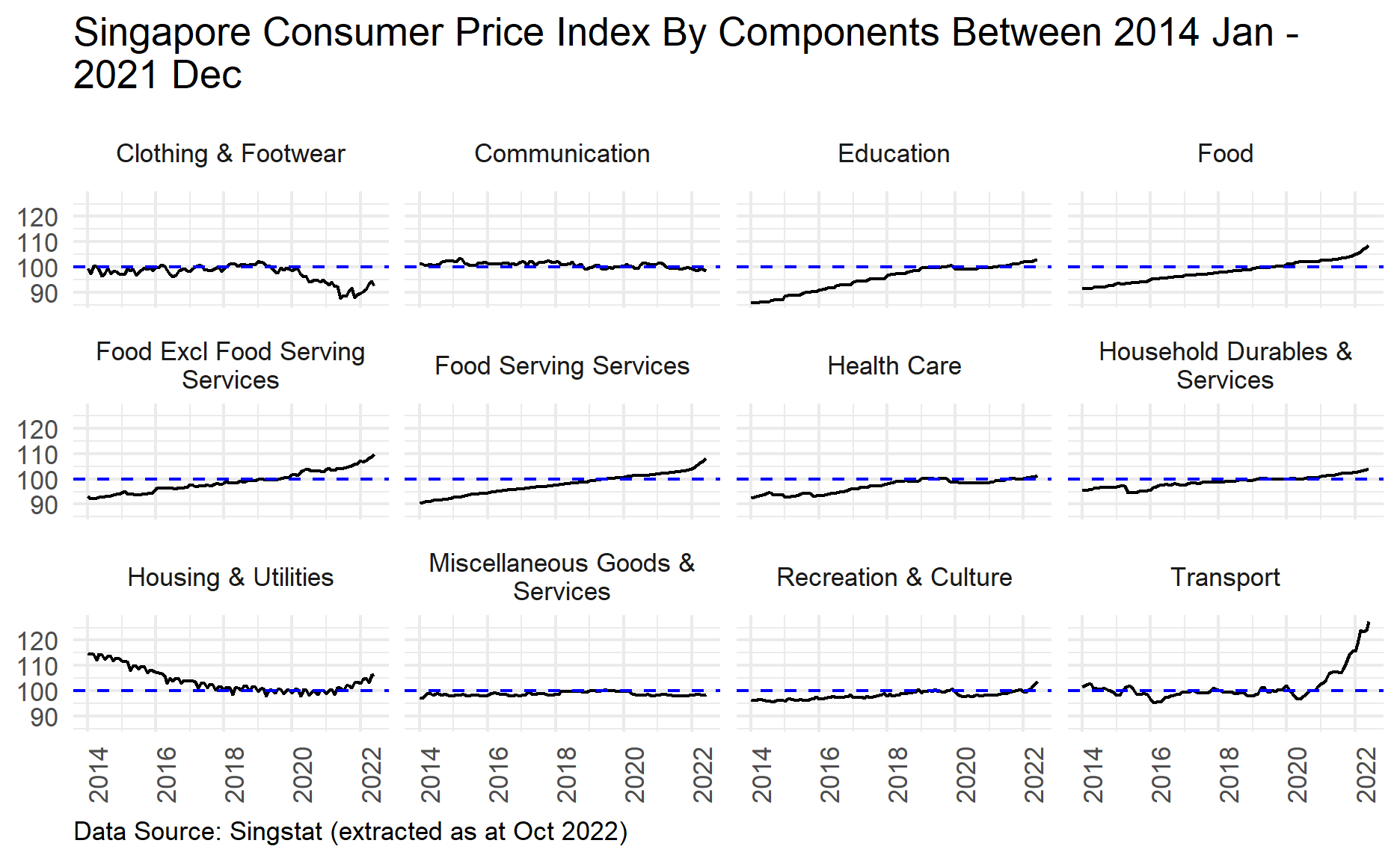 labs(title = str_wrap("Singapore Consumer Price Index By Components Between 2014 Jan - 2021 Dec", 65),