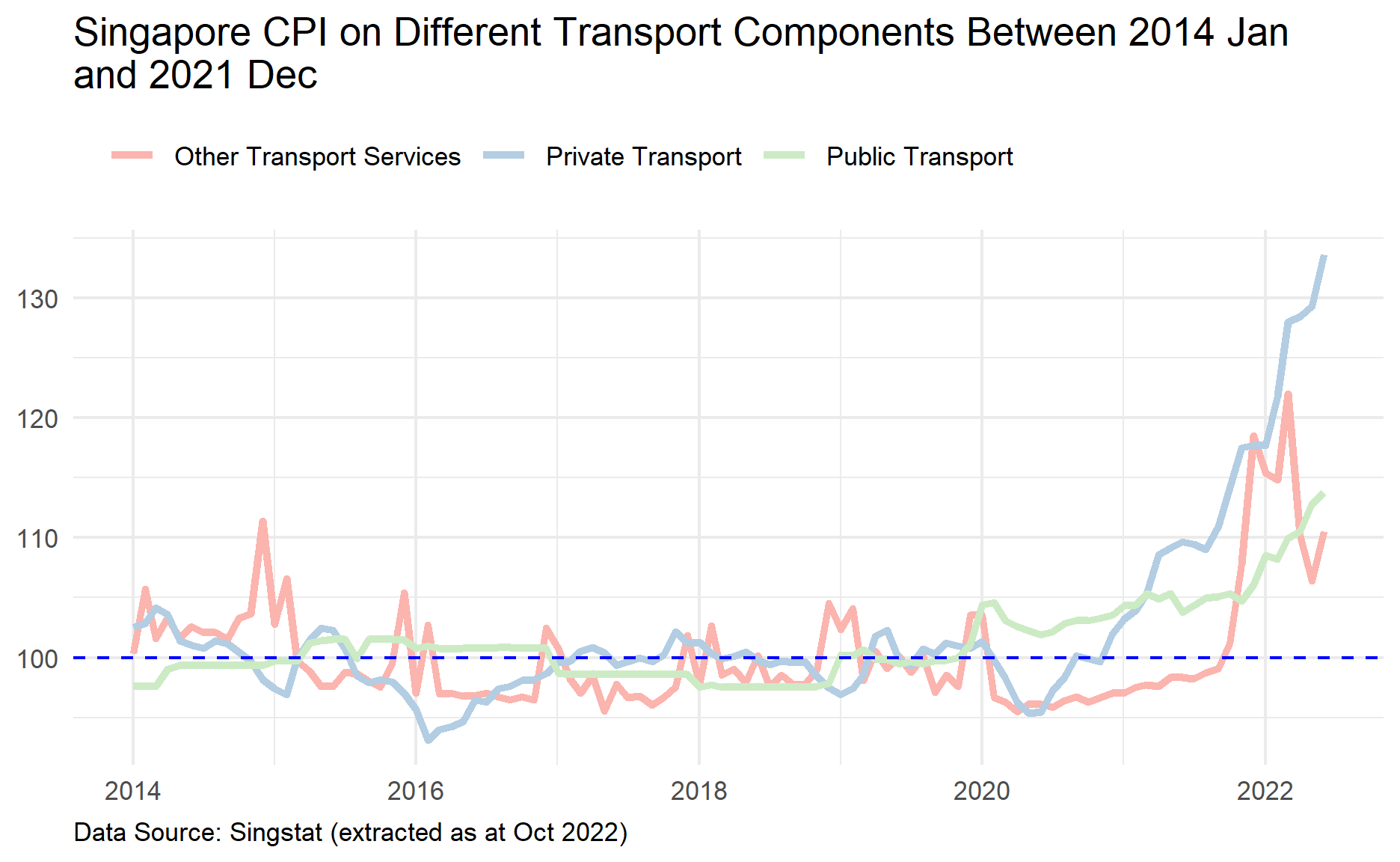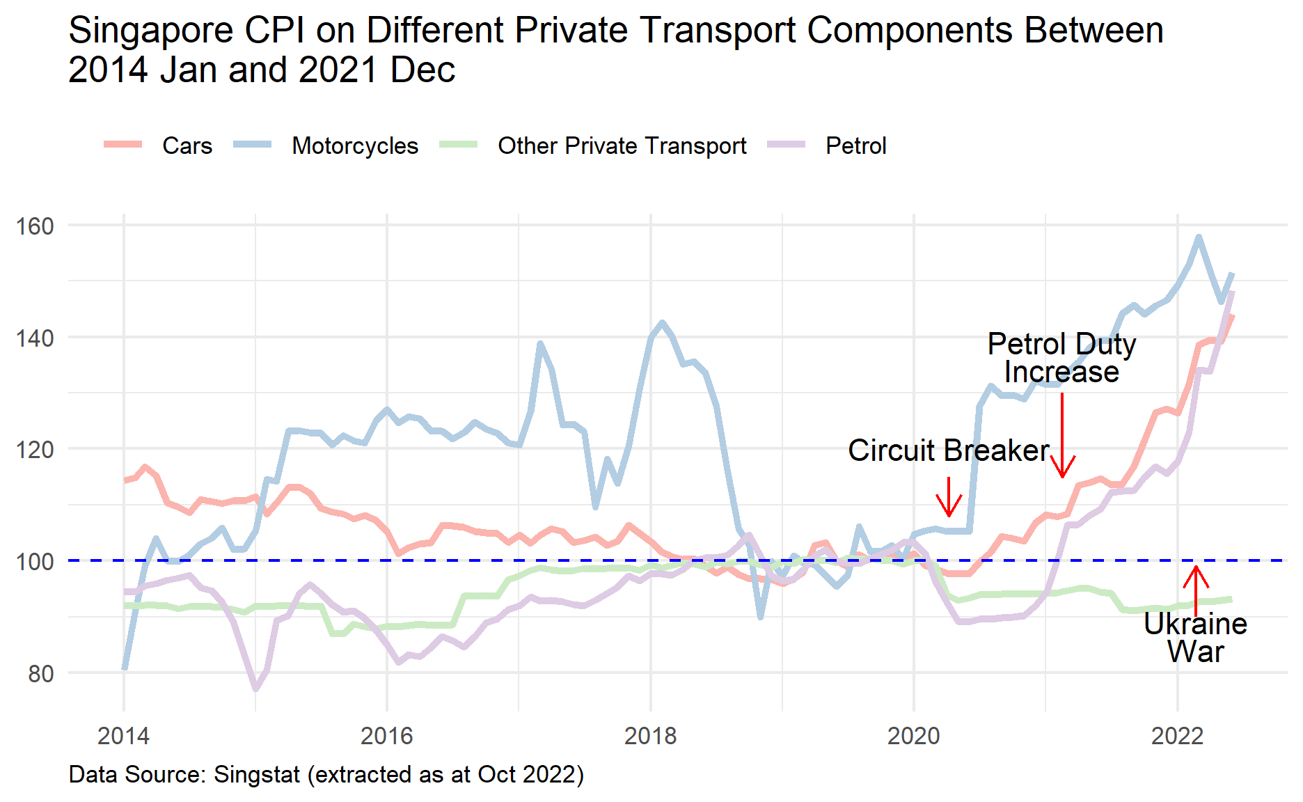 labs(title = str_wrap("Singapore CPI on Different Private Transport Components Between 2014 Jan and 2021 Dec", 65),