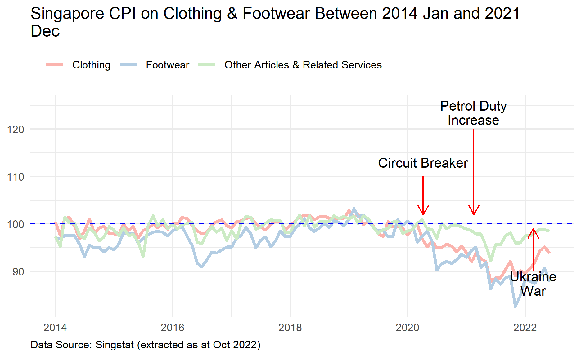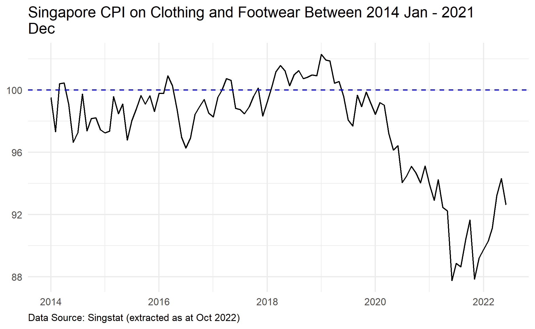 labs(title = str_wrap("Singapore CPI on Clothing & Footwear Between 2014 Jan and 2021 Dec", 65),