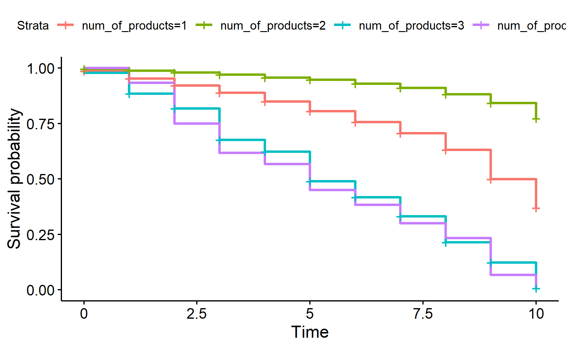 For example, if we plot out the survival curve for customers that held a different number of products, it seems like the survival curves for customers who held 3 products and customers who held 4 products are rather similar.