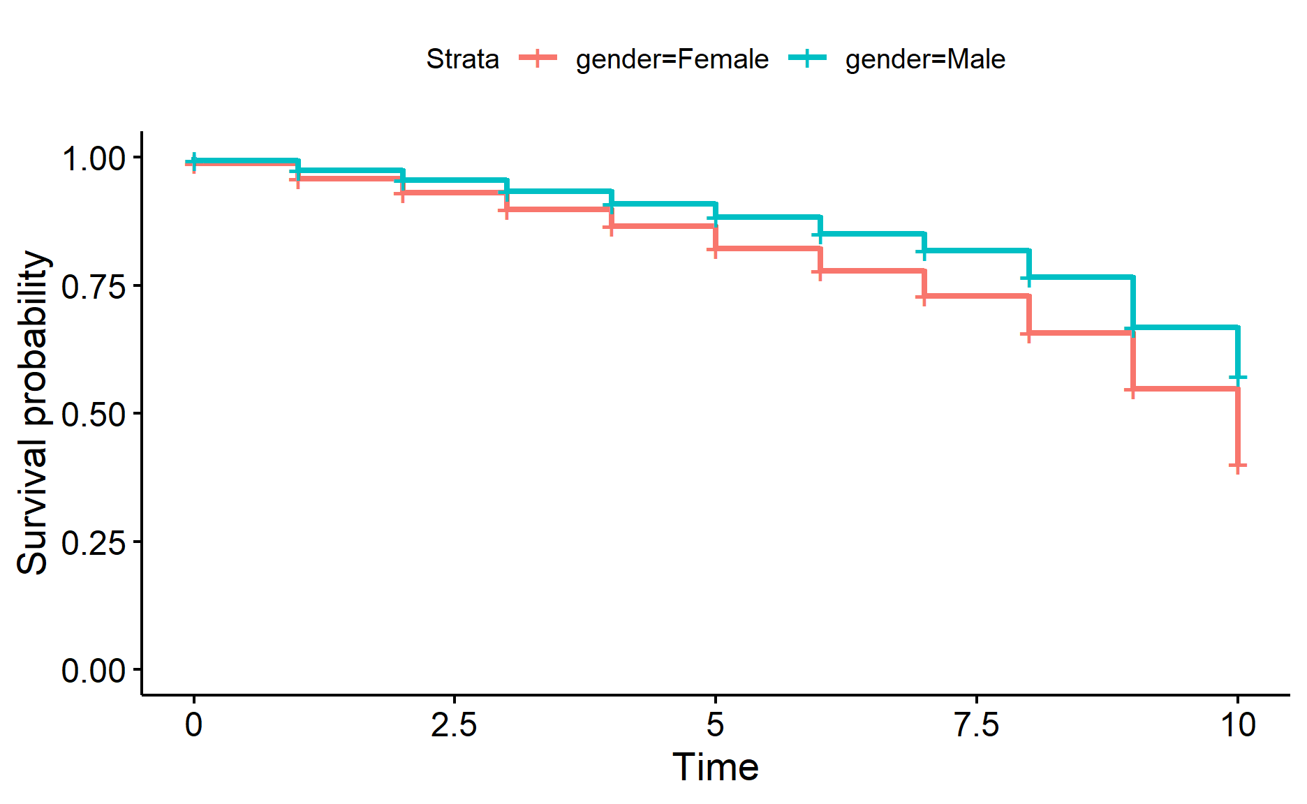 surv_fit <- survfit(Surv(tenure, exited) ~ gender, data = df)