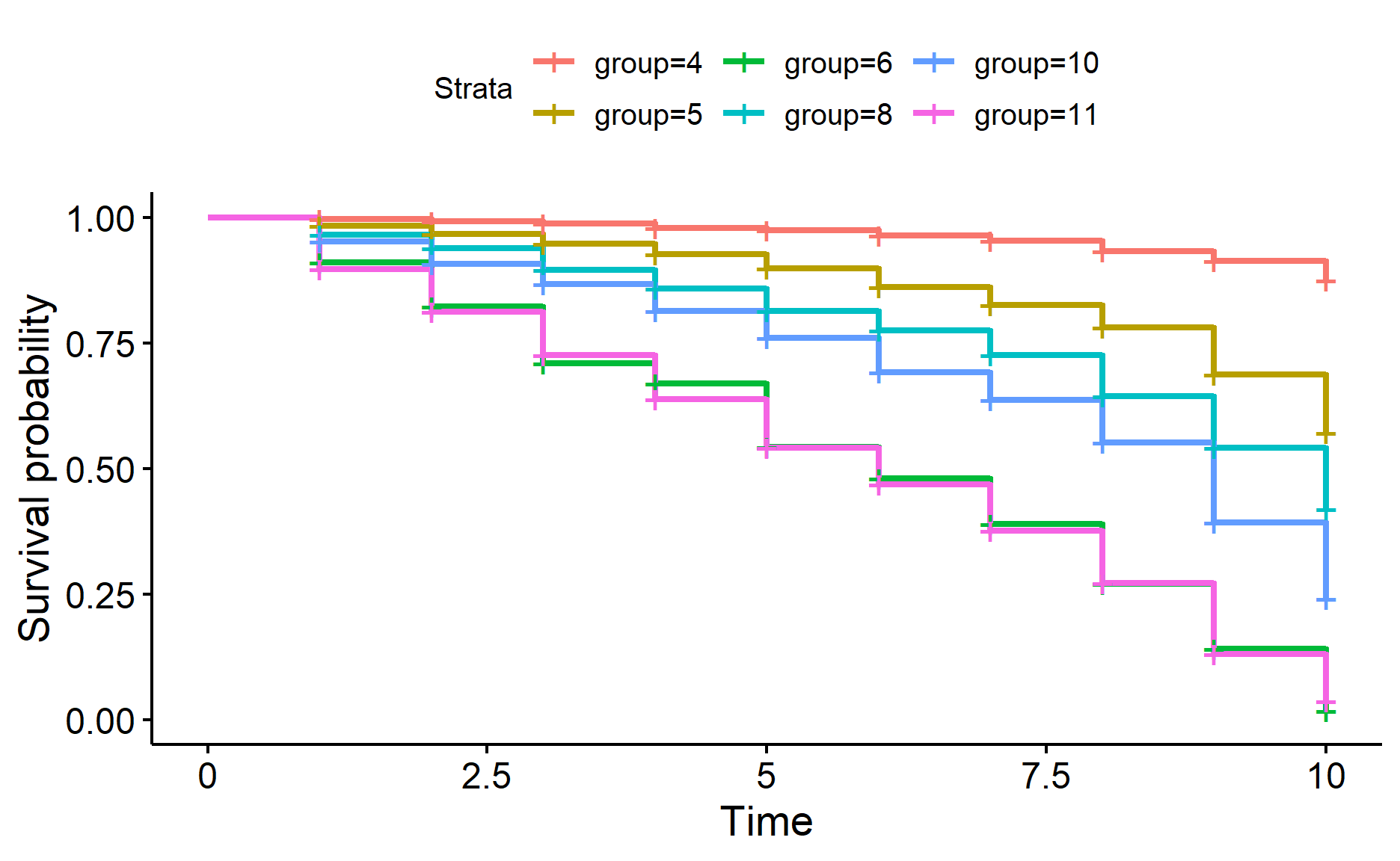 Alternatively, we could visualize the survival curves of the different groups by using ggplot function.
