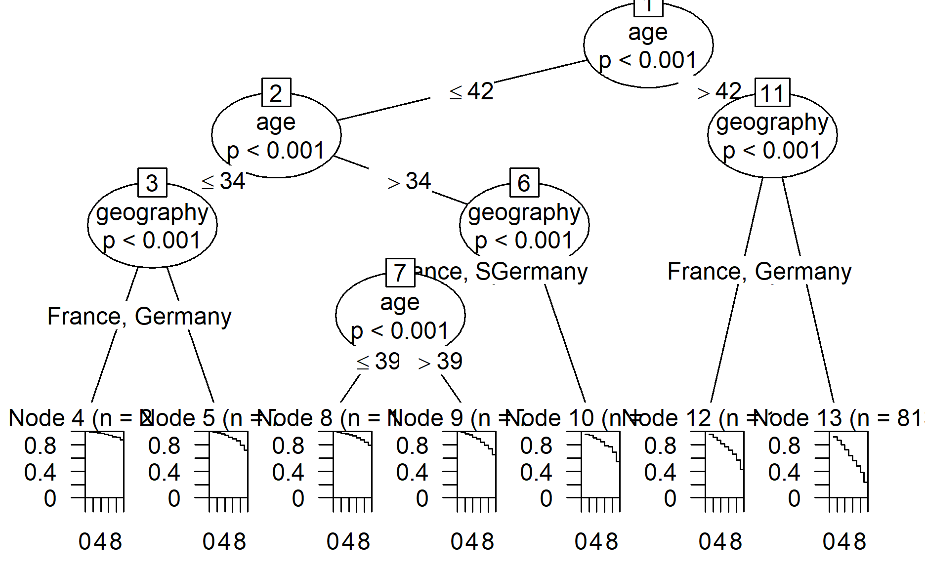 ctree(Surv(tenure, exited) ~ age + geography, data = df_factor)
