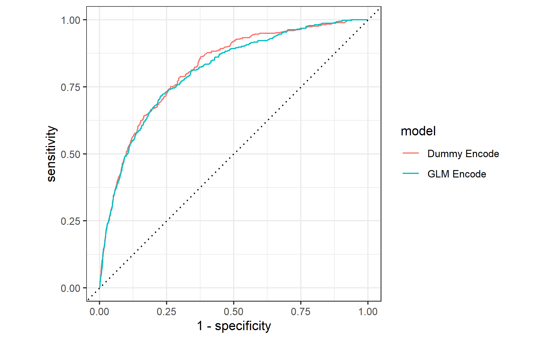 While the model performance under the dummy encoding method is slightly better than GLM encoding, the sensitivity performance is slightly worse for the dummy encoding