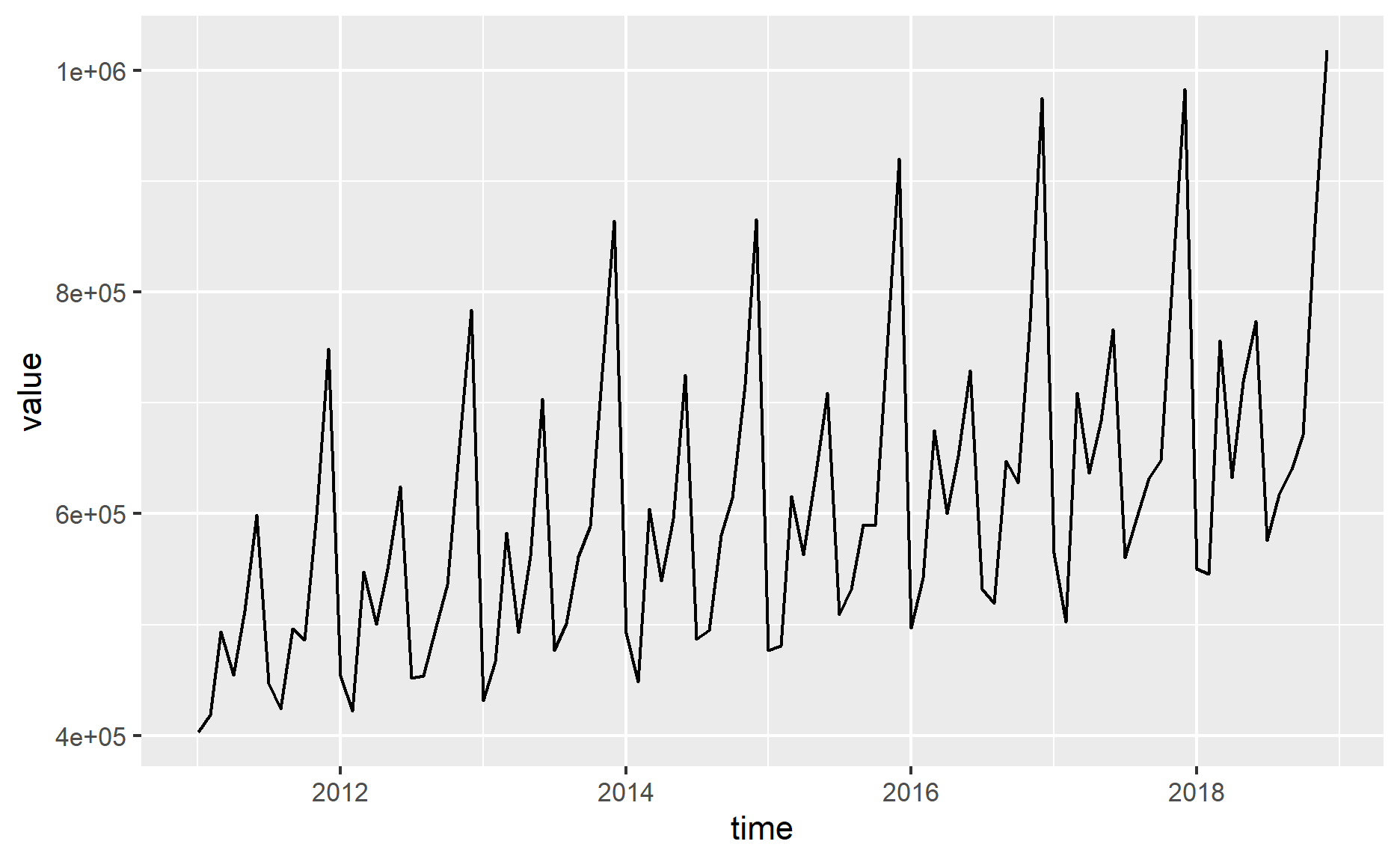 Next, I will visualize the time series by using various ggplot functions.