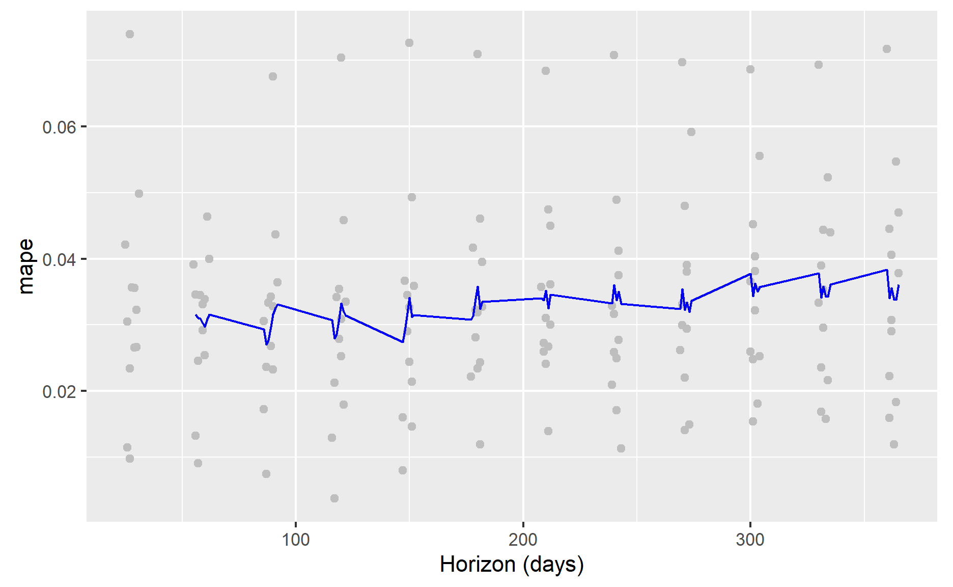 The blue line represents the MAPE, where the mean is taken over a rolling window of the dots.