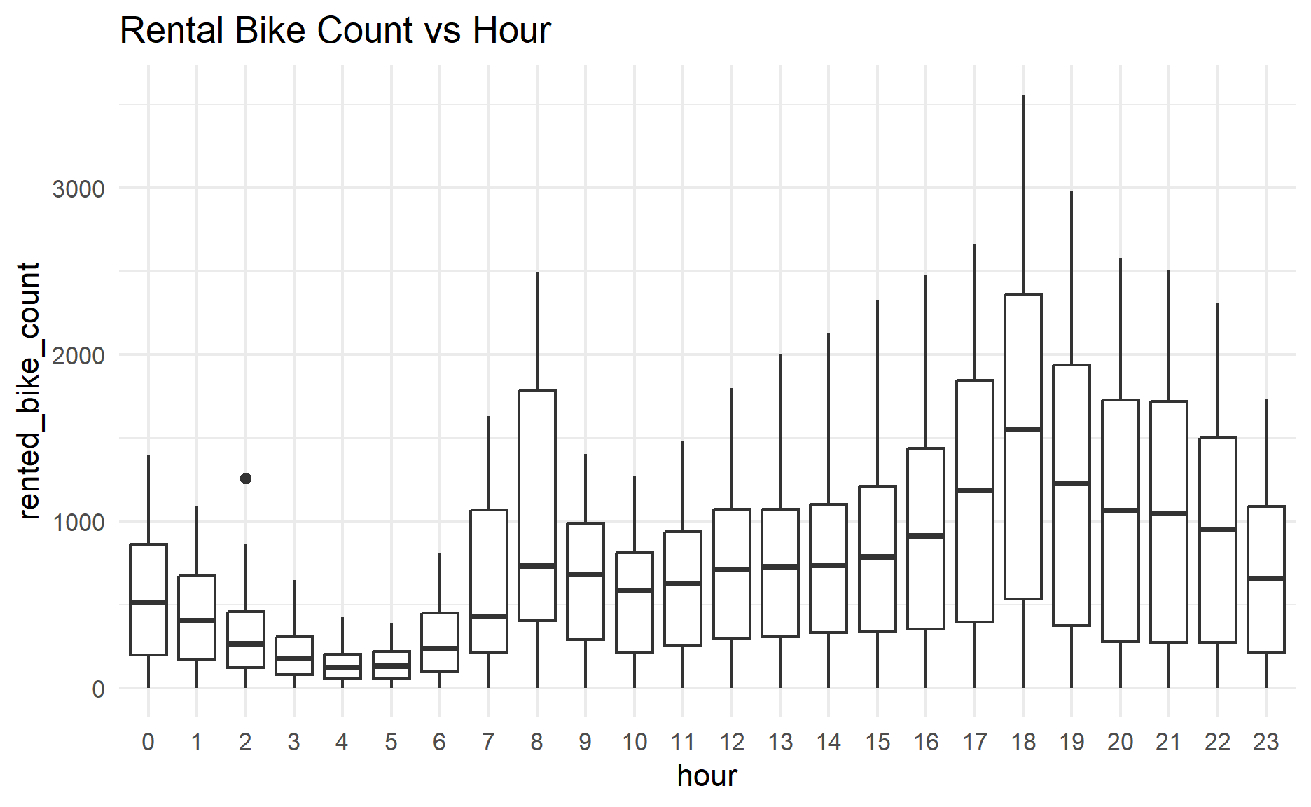 If we were plot the rental bike count by the weather temperature, we noted that the rental bike count increases when the temperature increases. The count peaks at around 23 degree and starts to drop when the temperature continues to increase.
