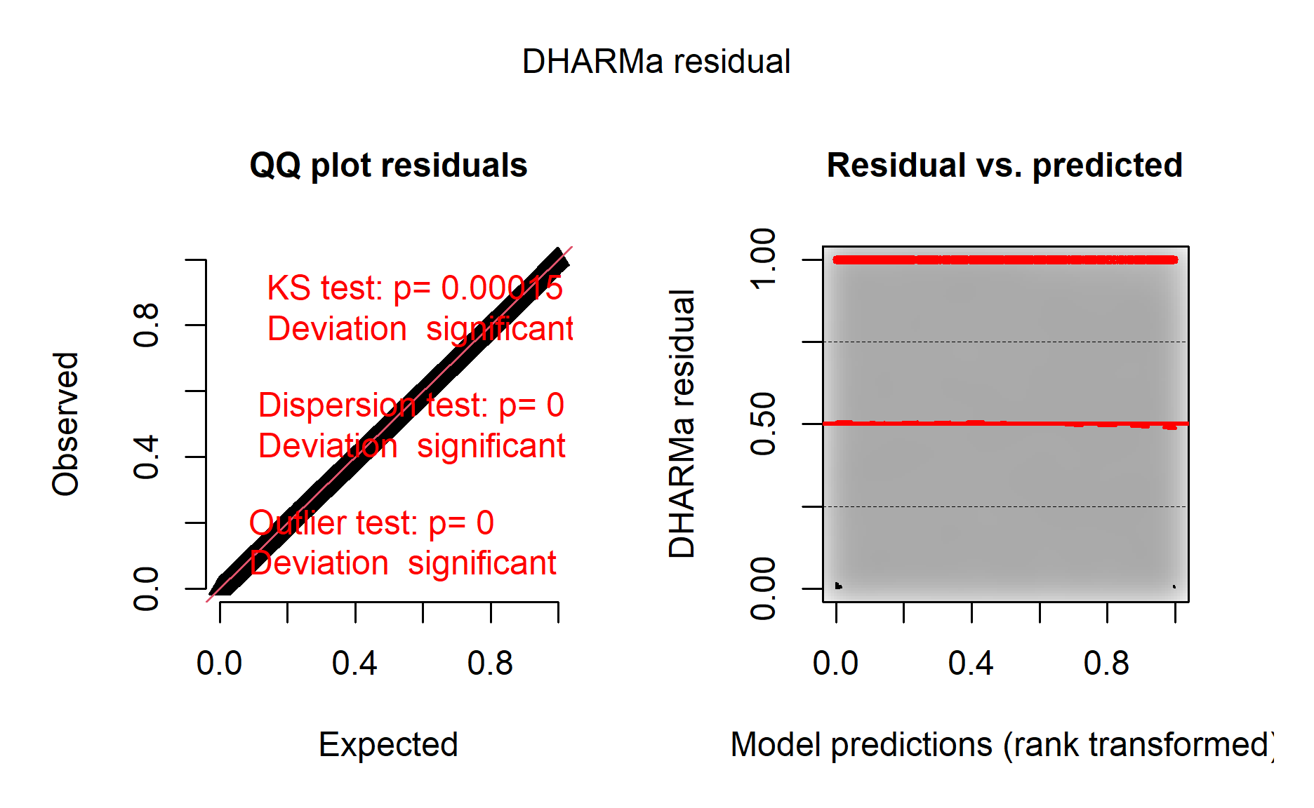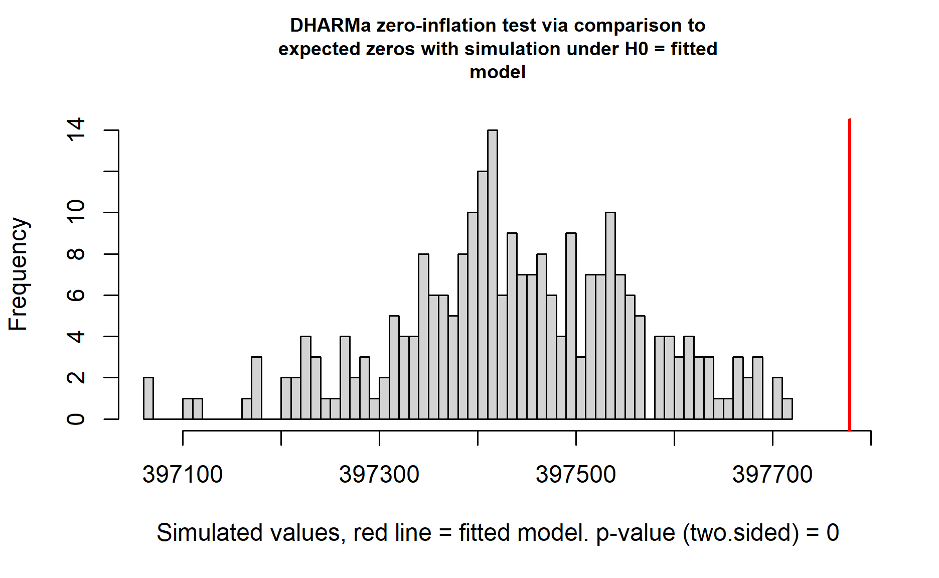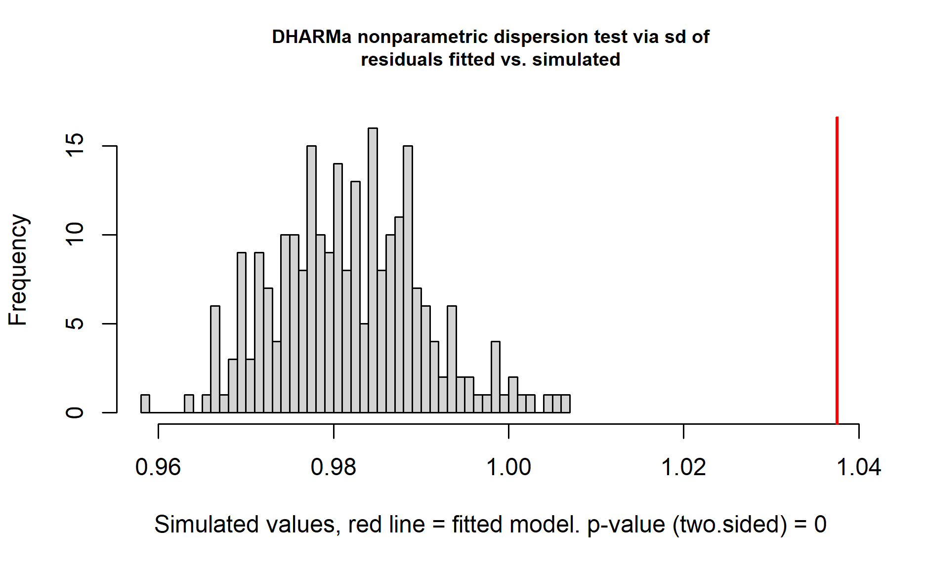 However, as mentioned in the vignette by DHMARMa package, overdispersion could lead to excess zeros. Hence, I will perform dispersion test next.