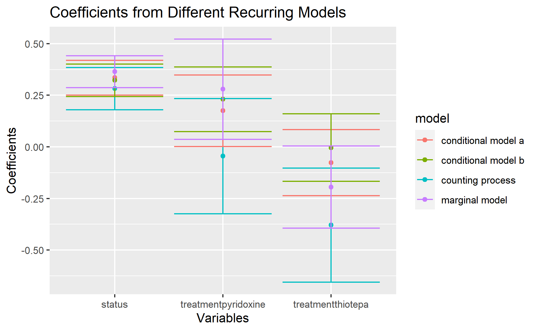 | Conditional Model B | Very useful for modelling the time between each recurrent event rather than the full time course of the recurrent event process |