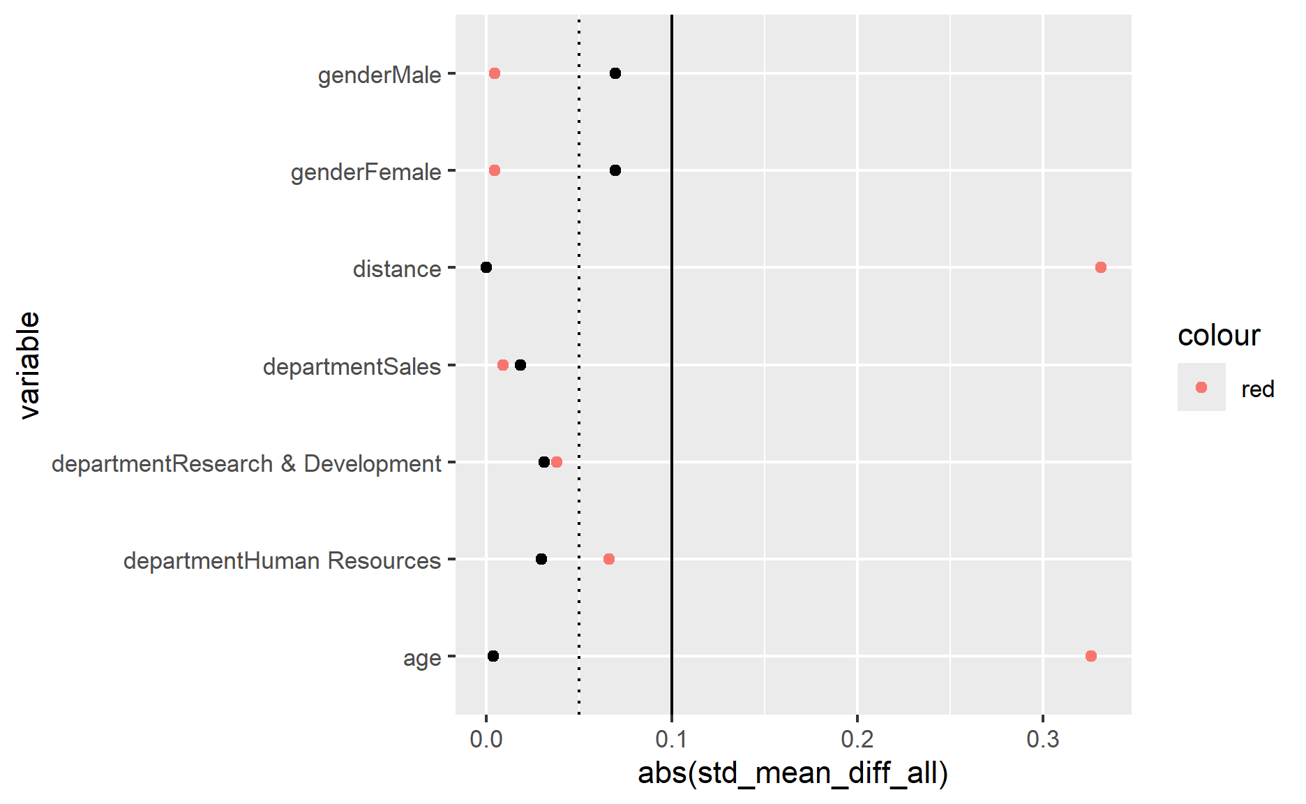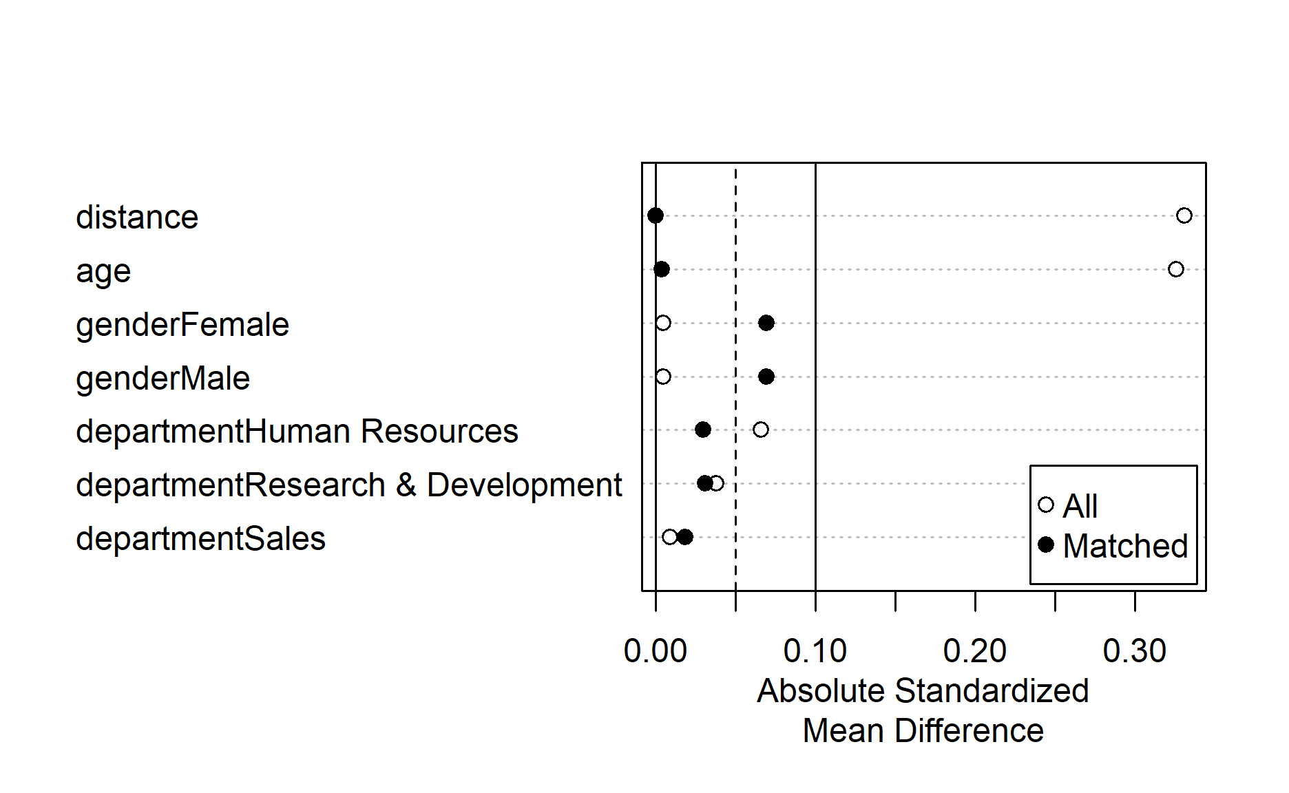 The absolute standardized mean difference for gender increases after matching, but they are still below the 0.1 threshold. Hence for simplicity, I will leave it as it is.