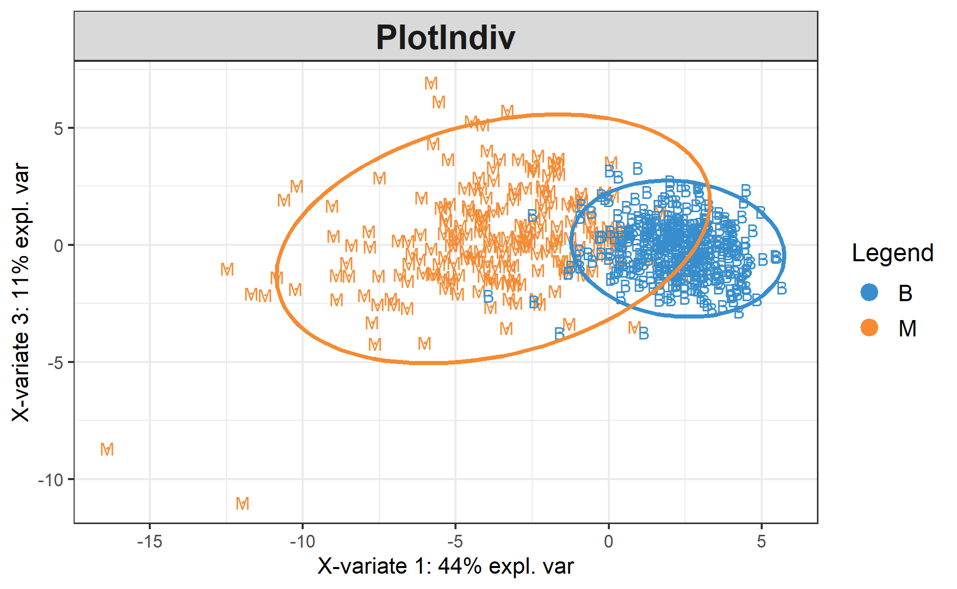 plotIndiv(pls_fit$fit$fit$fit, comp = c(1, 3),ind.names = df$diagnosis, legend = TRUE, ellipse =TRUE)